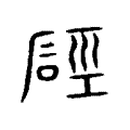,上左像磬,右改為用殳擊磬,而增以石形,則表磬質為石,由石製成,構形應是從石、殸聲。隸書、楷書之磬,都承篆文之形而來。在六書中屬於形聲兼會意。籀文作
